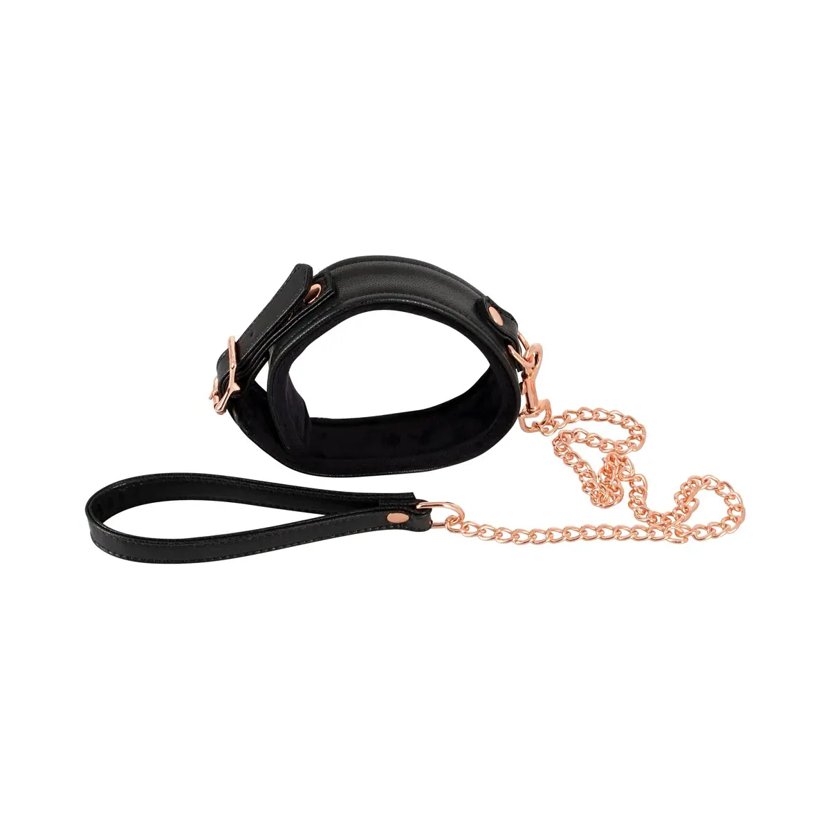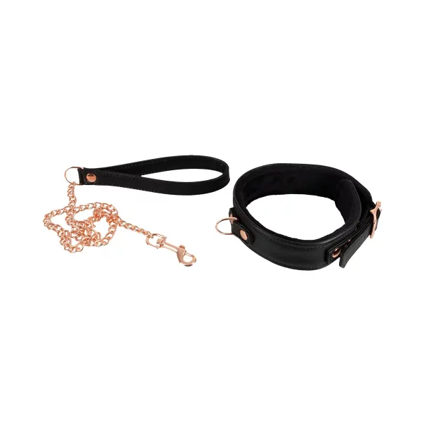 Collar and leash in a set from Bad Kitty. The Bad Kitty collar and wrist loop are in a black leather look. The leash has a rose-gold coloured chain. The collar has soft plush inside and there is a ring at the front where the included leash can be attached. The collar also has a buckle fastener so that the circumference can be adjusted form 30 to 40 cm. Chain leash with a snap hook (without wrist loop) 65 cm long.