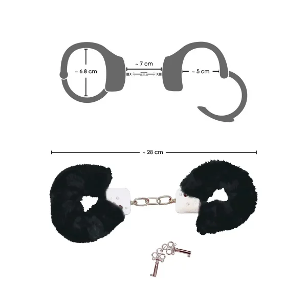 Manette in metallo rivestite di morbido peluche nero (poliestere). Polsini di sicurezza, si aprono con una chiave o con un clic. Rivestimento tessile sfoderabile.